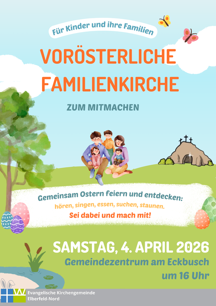 Am Samstag 4. April laden wir herzlich zur Vorösterlichen Familienkirche zum Mitmachen ein. Eingeladen sind alle Kinder mit ihren Familien. Wir treffen uns um 16 Uhr am Gemeindezentrum Eckbusch und starten gemeinsam in den Nachmittag. Wir werden gemeinsam, singen, staunen, essen und suchen.
